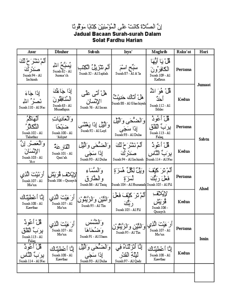 Jadual Bacaan Surah Surah Dalam Solat Fardhu Harian