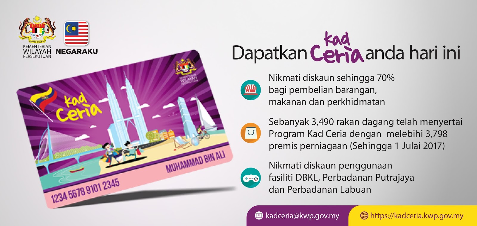 Kad ceria wilayah persekutuan. Kad ceria is a discount card that been given to all residents in wilayah persekutuan that includes kuala lumpur putrajaya and labuan with the initiative to help reducing the financial burden of this community. Program ini merupakan inisiatif kementerian wilayah persekutuan dalam usaha menangani kos sara hidup bagi warga wilayah persekutuan. Program ini adalah salah satu inisiatif kementerian wilayah persekutuan dalam usaha membantu menangani kos sara hidup yang tinggi terutamanya bagi warga wilayah persekutuan wp. Ini adalah kad ekslusif untuk rakyat malaysia yang menetap kat wilayah persekutuan kuala lumpur putrajaya dan labuan untuk nikmati diskaun istimewa bila membeli barangan keperluan dan perkhidmatan.