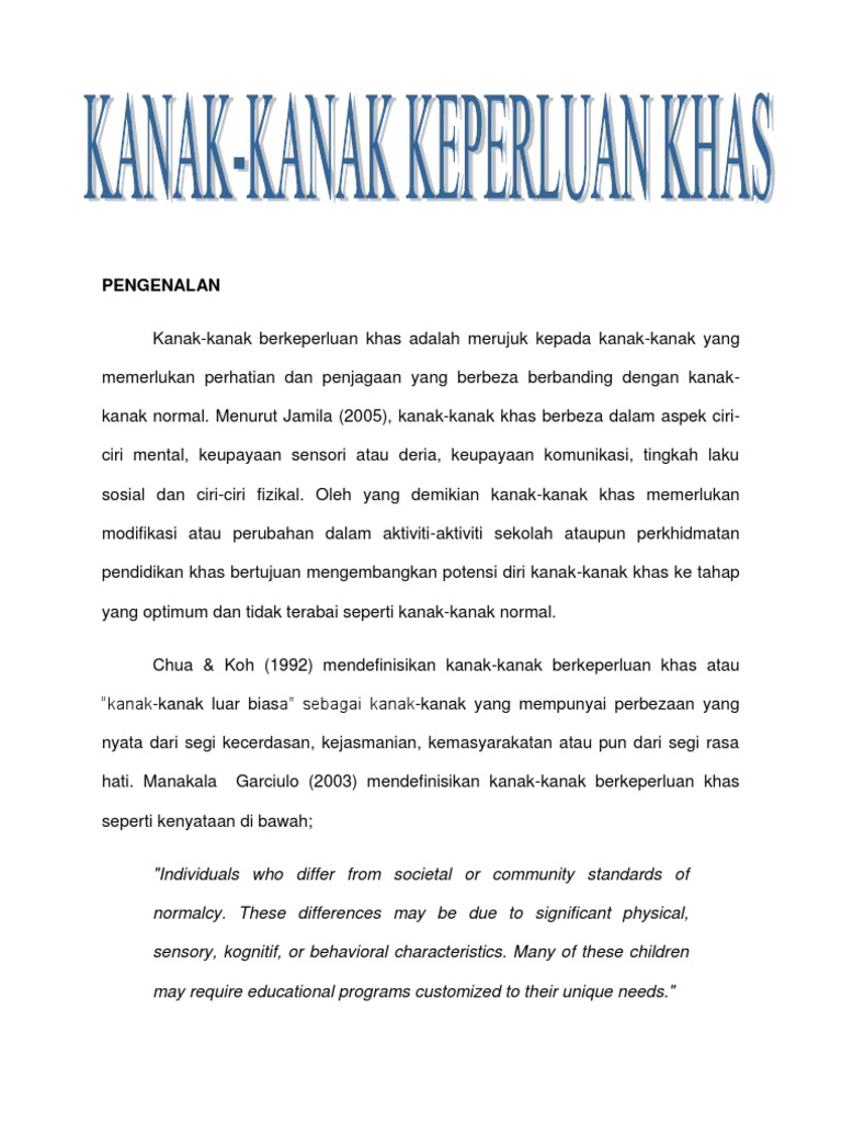 Kanak kanak berkeperluan khas. Definisi maksud definisi menurut kamus dewan edisi ke 3 ialah kenyataan yg ringkas dan padat bagi menjelaskan konsep atau makna sesuatu kata frasa dan lain lain takrif. 2 1 kanak kanak berkeperluan khas menurut wright 1998 kanak kanak khas didefinisikan sebagai kanak kanak yang berbeza daripada kanak kanak biasa dalam aspek ciri ciri mental keupayaan sensori keupayaan komunikasi tingkah laku sosial ataupun ciri ciri fizikal. Terdapat pelbagai kategori kanak kanak berkeperluan khas dan golongan kanak kanak istimewa ini mestilah dikenal pasti ketidakupayaan mereka bagi memenuhikeperluan perkembangan intelek emosi rohani dan jasmani berdasarkan kepercayaandan kepatuhan kepada tuhan abu bakar ikhsan 2003. Rahim 2006 2 0 kanak kanak berkeperluan khas 4.