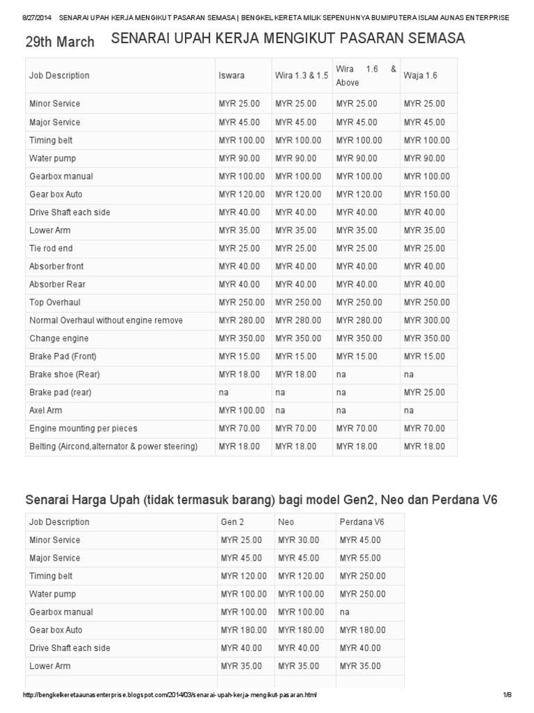 Senarai Upah Kerja Mengikut Pasaran Semasa Bengkel Kereta Milik Sepenuhnya Bumiputera Islam Aunas Enterprise Transmission Mechanics Automobiles