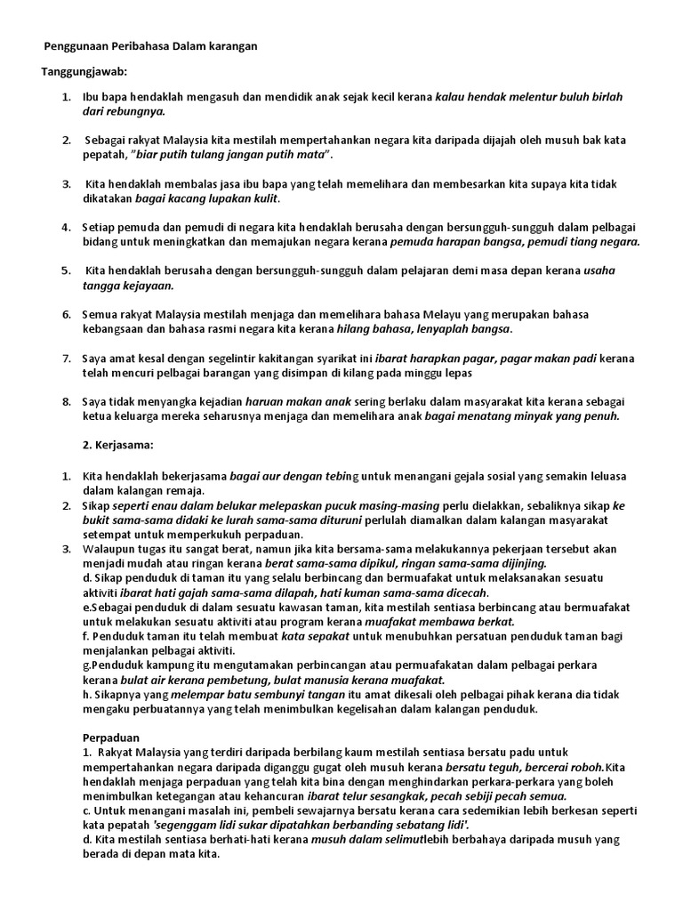 Penggunaan Peribahasa Dalam Karangan Berkaitan Tanggungjawab Perpaduan Dan Sbgnya