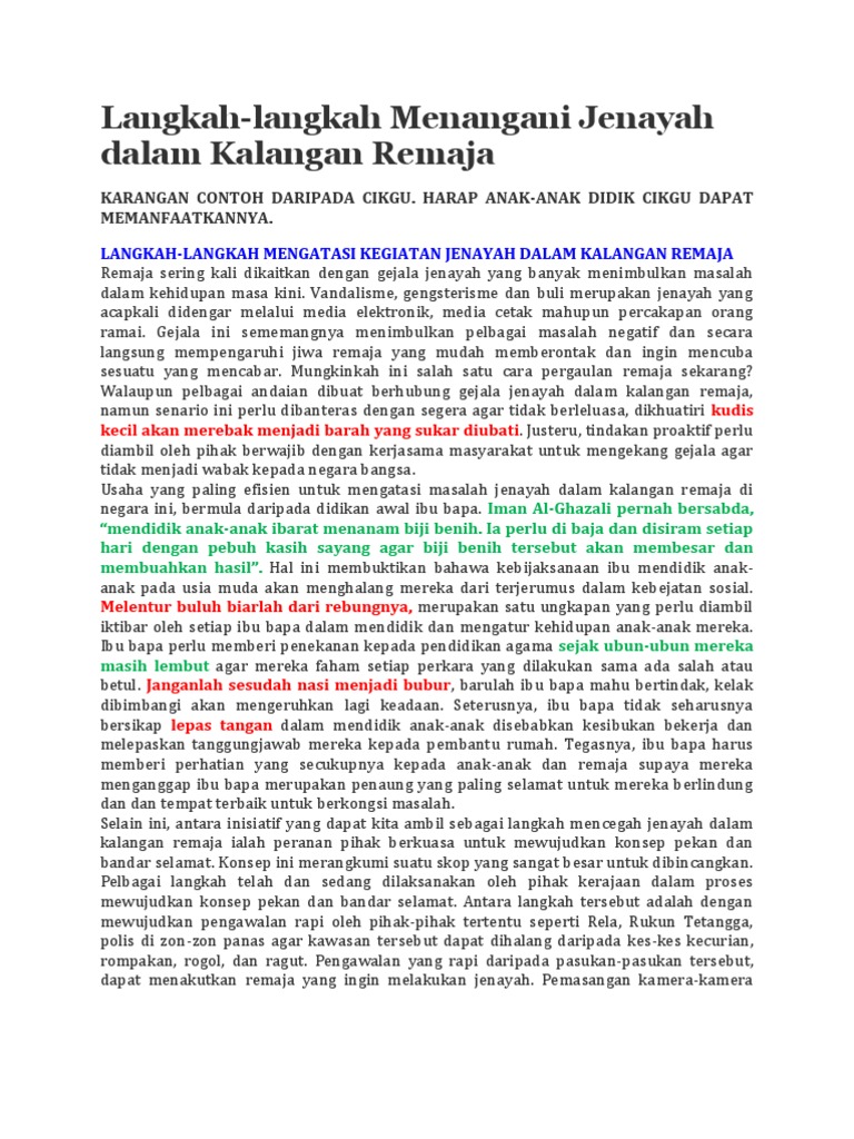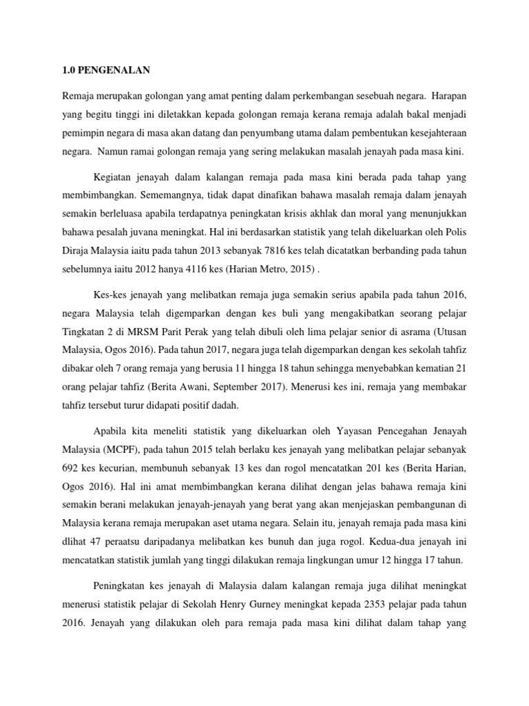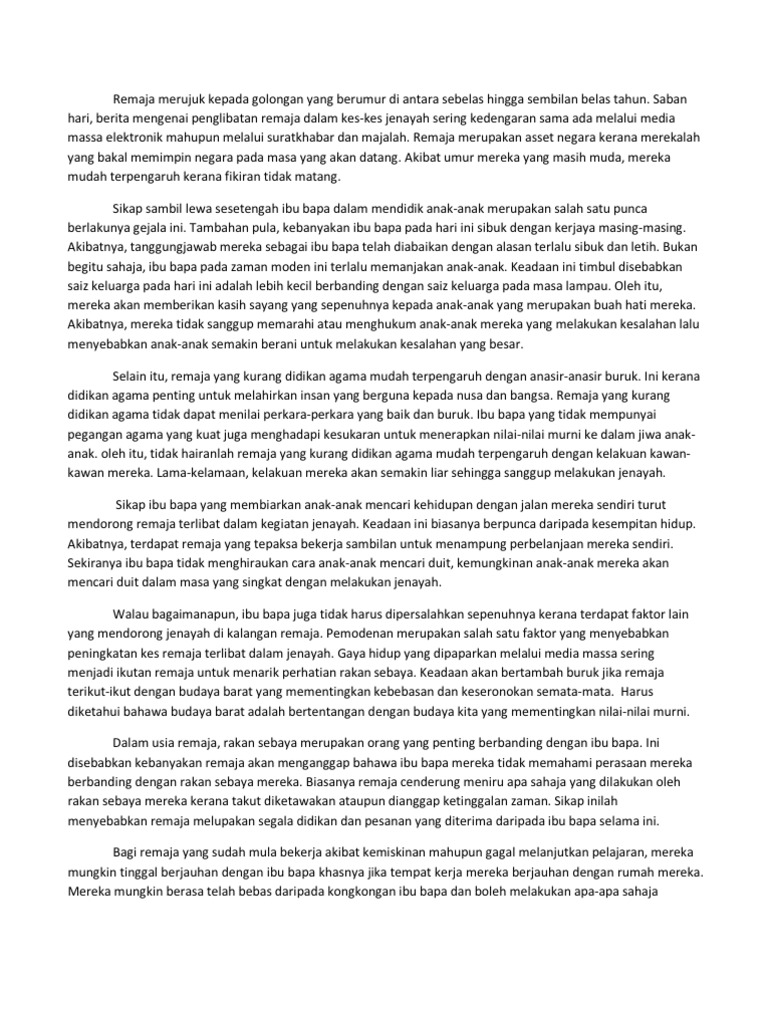Karangan jenayah dalam kalangan remaja. Konklusinya kegiatan jenayah dalam kalangan remaja mendatangkan impak negatif kepada diri masyarakat dan negara malah turut menjadi virus epidemik yang akan menjatuhkan imej negara di mata seantero dunia. Hari ini masyarakat kita telah dikejutkan dengan pelbagai kes jenayah yang melibatkan pelajar dan remaja. Semakin hari kes kes jenayah ini semakin berleluasa lsu ini sungguh memalukan memandangkan negara kita sekarang merupakan negara yang sedang pesat membangun. Kesalahan jenayah dalam kalangan remaja terutama pelajar di negara ini masih di tahap membimbangkan dan usaha pencegahan perlu dipergiatkan lagi supaya perkara itu dapat ditangani sewajarnya.