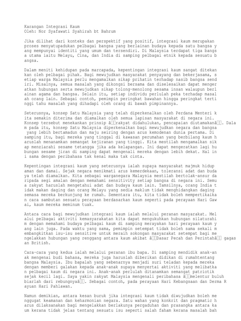 Karangan kepelbagaian kaum di malaysia. Di malaysia kepebagaian umat dipersatukan dalam. Melayu adalah satu kaum yang beragama islam berbahasa melayu dan mengamalkan budaya melayu. Walaupun terdiri daripada latar belakang yang berbeza namun apabila dikaitkan dengan kebudayaan semua rakyat boleh menerimanya tanpa wujud prasangka. Pada zaman pemerintahan british di negara ini mereka mengamalkan dasar pecah dan perintah terutama membiarkan penduduk negara ini mengamalkan kegiatan ekonomi masing masing mengikut komposisinya.