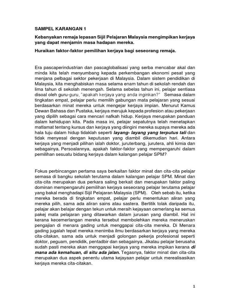 Sampel Karangan 1 Faktor Faktor Pemilihan Kerjaya Bagi Seseorang Remaja