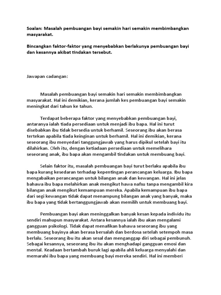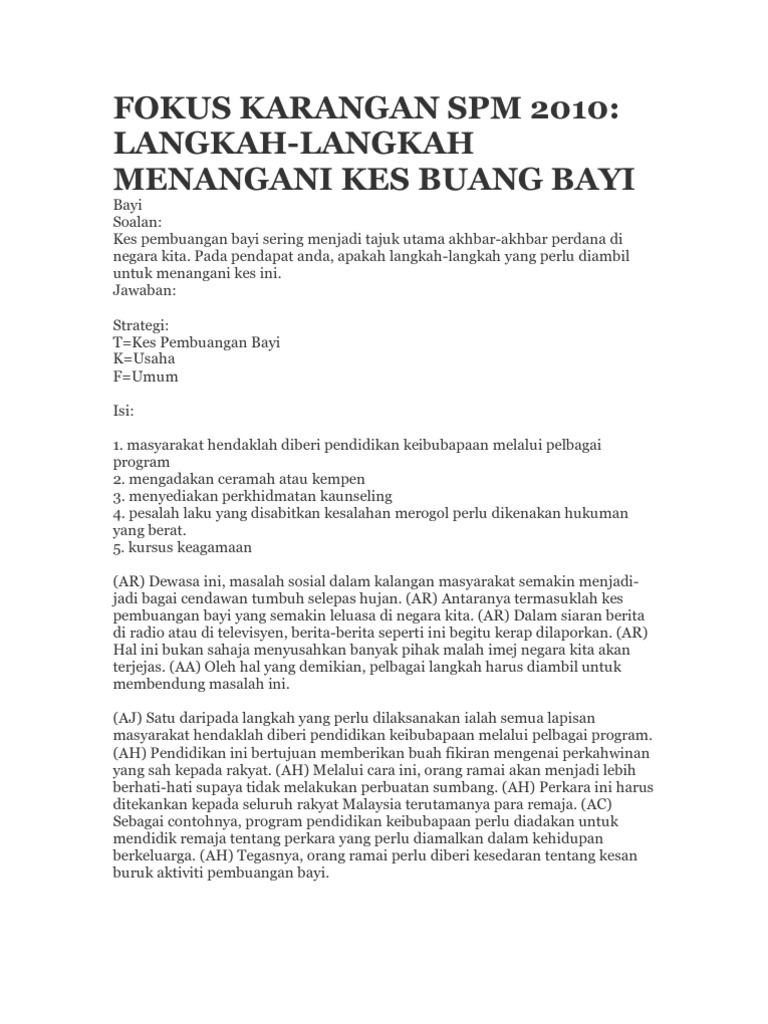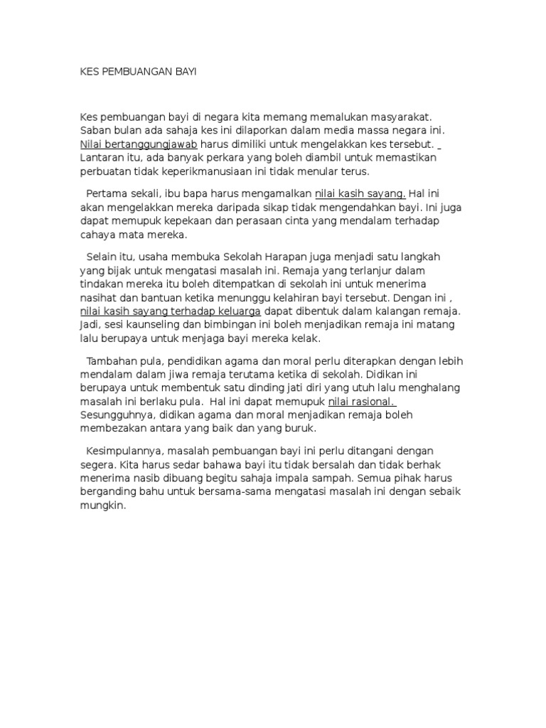 Bagi kebanyakan kes perempuan yang dipersalahkan dan terpaksa menanggung beban di atas perbuatan tersebut. Karangan spm 10 pembuangan bayi pembuangan bayi biasanya melibatkan golongan remaja yang bertindak terburu buru ketika mengambil tindakan. Akhir akhir ini berita tentang gejala pembuangan bayi dapat diperhatikan pada dada akhbar gejala ini telah menjadi buah mulut masyarakat dan turut mendapat perhatian masyarakat dan media massa menularnya gejala ini mendatangkan pelbagai kesan negatif. Huraikan langkah langkah yang perlu diambil oleh ibu bapa untuk menangani masalah ini.