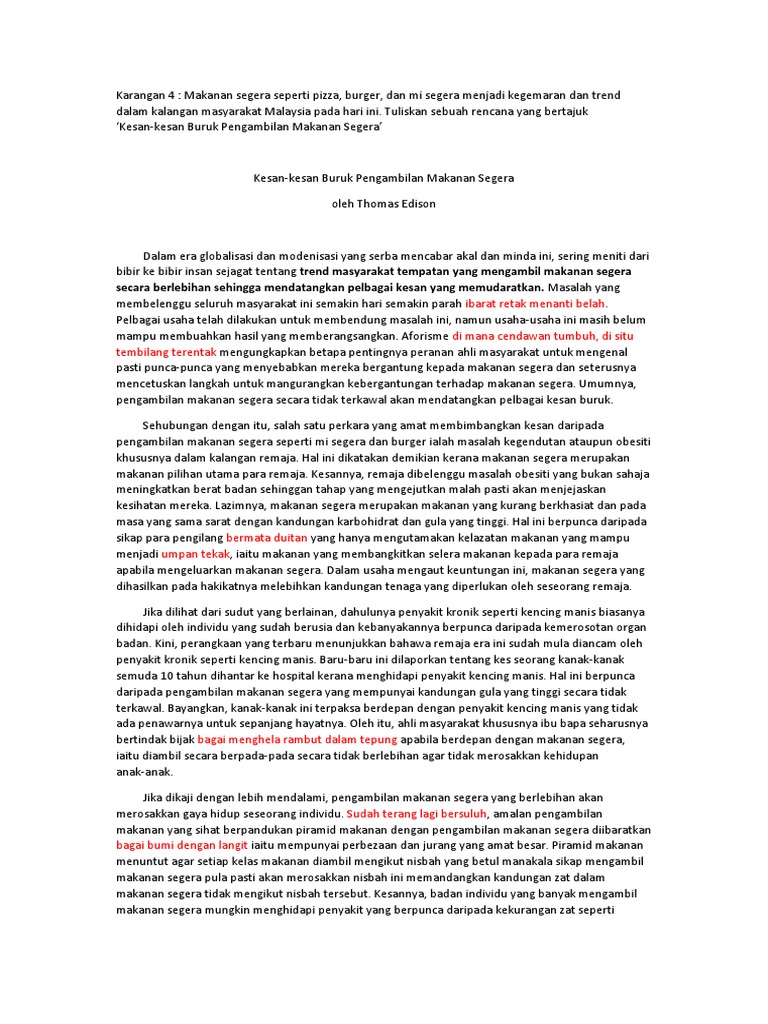 Karangan Kesan Pengambilan Makanan Segera