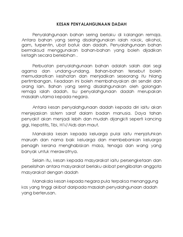 Karangan Kesan Penyalahgunaan Dadah Terhadap Masyarakat