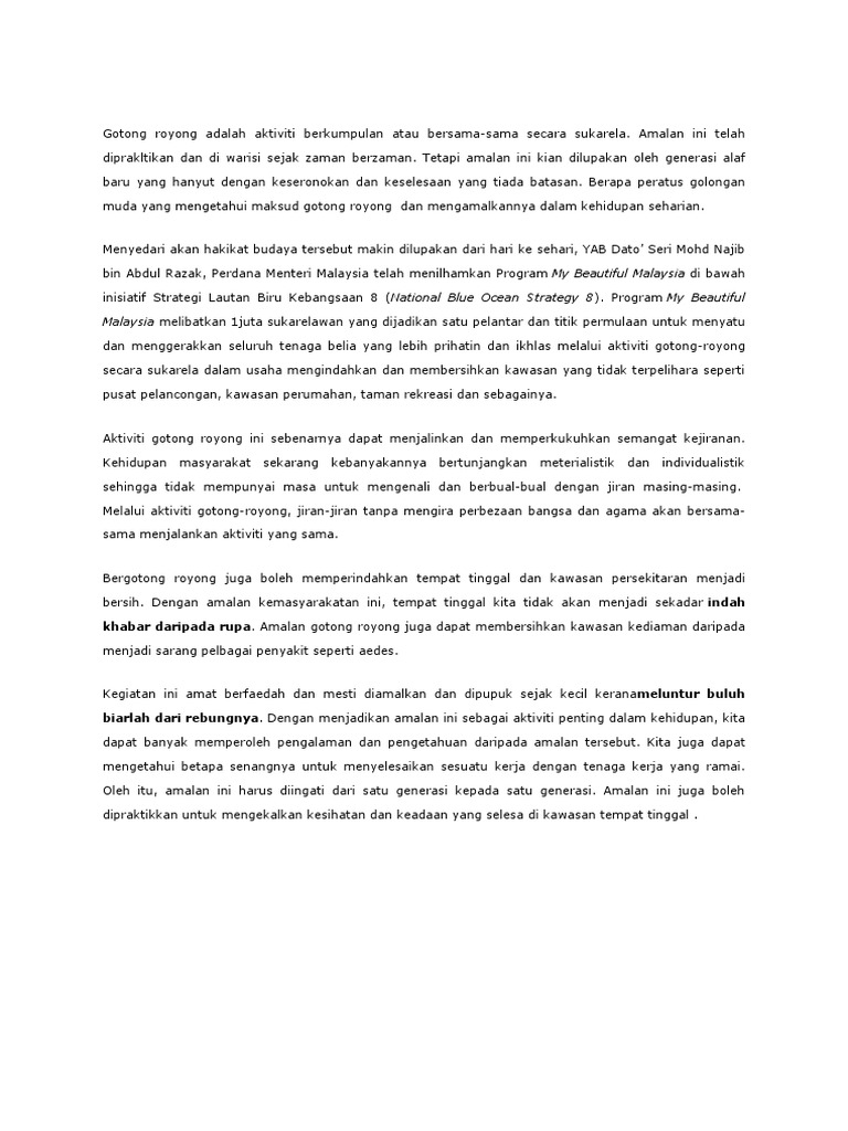 Kampung Anda Telah Mengadakan Gotong Royong Membersihkan Kawasan Kampung Tuliskan Sebuah Karangan Tentang Pengalaman Anda Semasa Menyertai Gotong Royong Tersebut