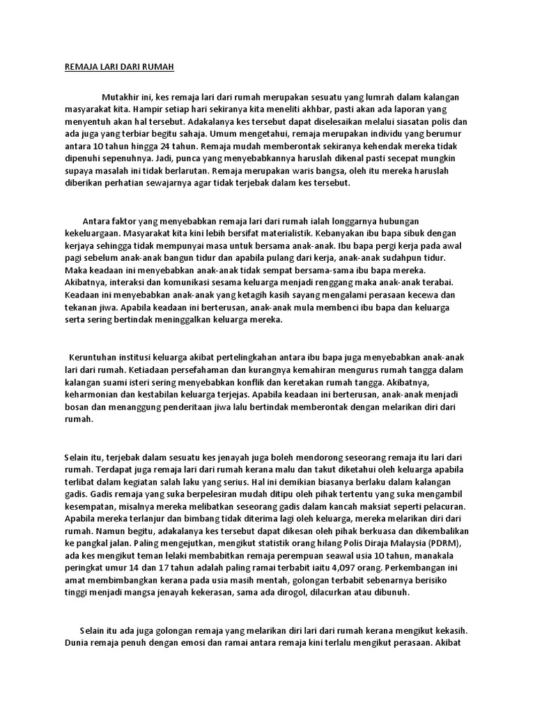 Ipendidikan karangan masalah lari dari rumah di kalangan remaja disemak dan dikemaskini pada pukul 3 32 pm 13 september 2020 guru guru sering kali menerima rungutan dan aduan daripada pelajar tentang kesukaran untuk menjawab penulisan karangan bahasa melayu. Masalah lari dari rumah di kalangan remaja. Remaja lari dari rumah sijil pelajaran malaysia. Tekanan emosi remaja islam universiti kebangsaan malaysia.