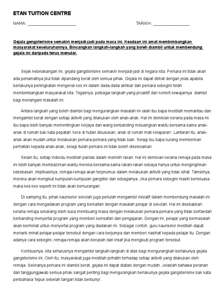 Contoh Karangan Gejala Sosial Tingkatan 2 Rasmi L