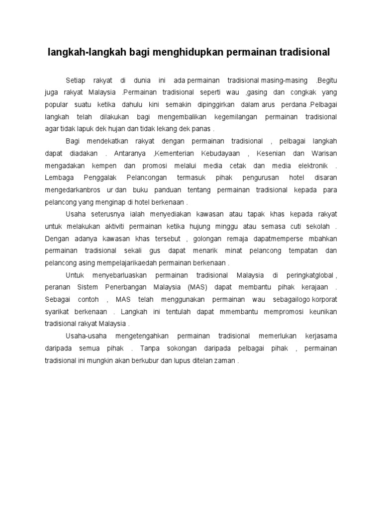 Kempen ini perlu dijalankan oleh jabatan kebudayaan dan kesenian negara secara terancang dan berkesan dengan kerjasama pihak media cetak dan media elektronik seperti akhbar dan. Contoh karangan spm usaha usaha mempopularkan permainan tradisional. Permainan tradisional merupakan salah satu budaya yang membentuk sebahagian daripada kehidupan yang dilalui oleh nenek moyang kita. Setelah mengetahui secara mendalam sesuatu permainan itu.