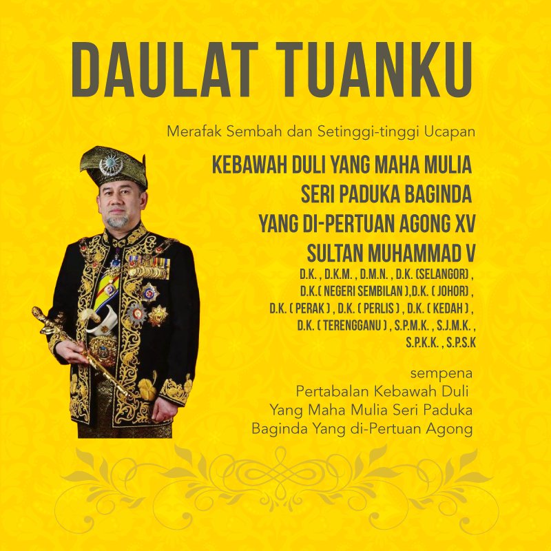 Ia diangkat sebagai yang di pertuan agong sejak 13 desember 2016. Sultan muhammad v daulat tuanku merafak sembah menjunjung kasih keberangkatan kebawah duli yang maha mulia seri paduka baginda yang dipertuan agong xv sultan muhammad v sempena lawatan ke negeri. His majesty kebawah duli yang maha mulia seri paduka baginda al sultan abdullah ri ayatuddin al mustafa billah shah ibni almarhum sultan haji ahmad shah al musta in billah the yang di pertuan agong of malaysia. Paduka means victorious and the term baginda is the malay possessive pronoun for a royal.