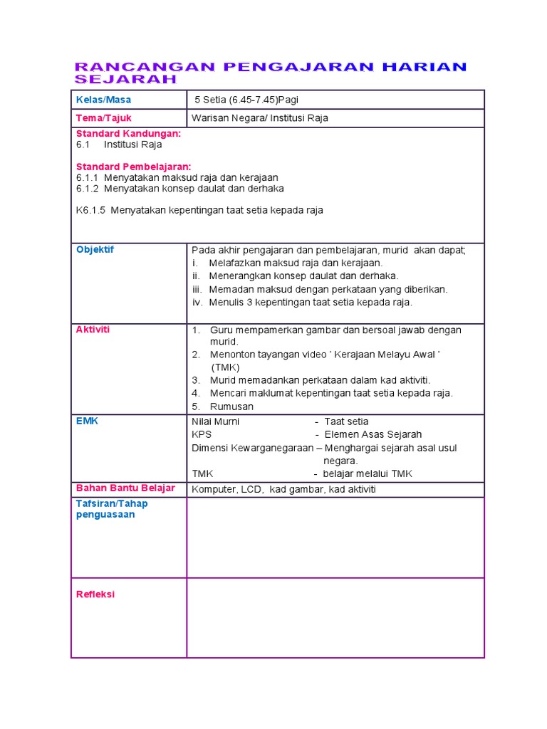 Rancangan Pelajaran Tahunan Sejarah Tahun 5 2018 K 6 1 5 Menyatakan Kepentingan Taat Setia Kepada Raja Objektif