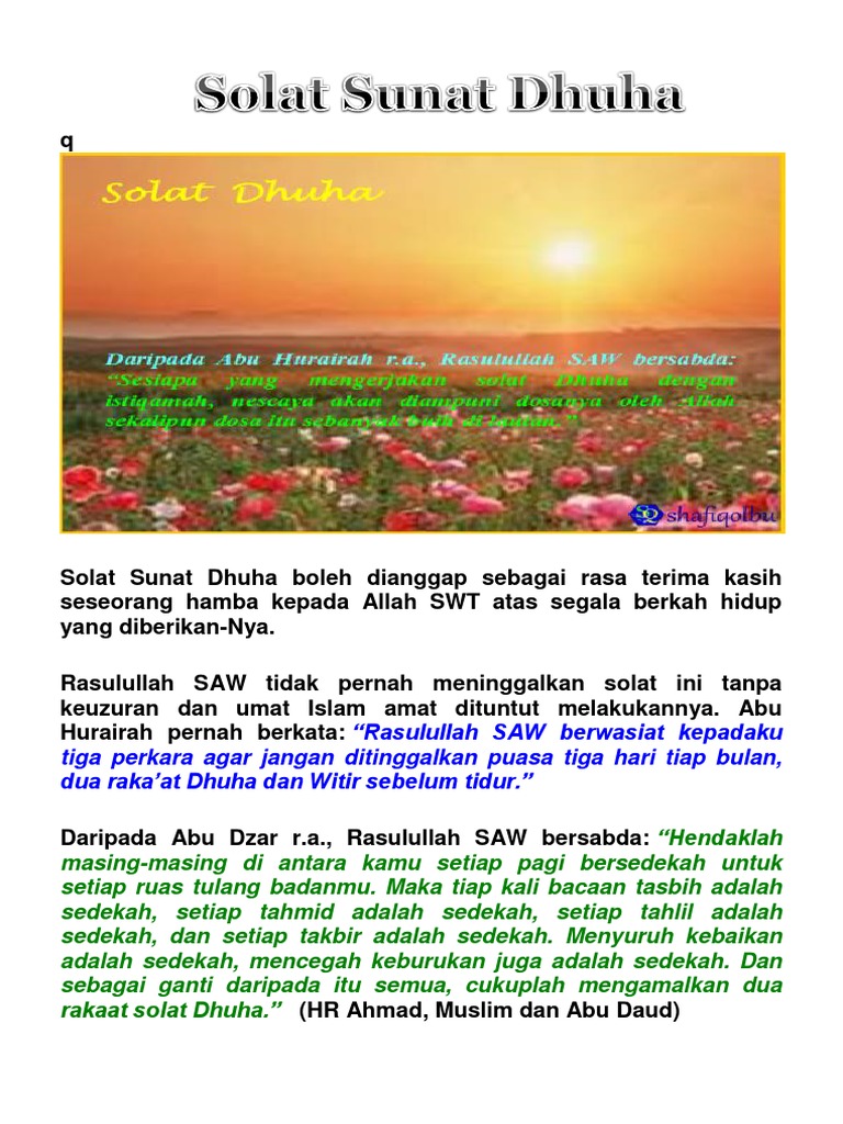 Kelebihan solat sunat dhuha. Doa solat sunat dhuha maksudnya. Gunakanlah kesempatan waktu dhuha untuk menunaikan solat sunat yang amat dituntut ini. Solat dhuha dilakukan dengan 2 rakaat untuk setiap kali solat dan boleh diulang sehingga 6 kali solat 2 rakaat x 6 kali solat setiap hari. Istimewanya waktu ini sehinggakan allah bersumpah dengannya di dalam surah ad dhuha.