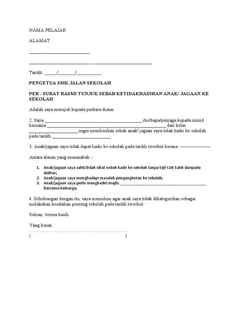 Download Contoh Surat Tidak Hadir Ke Sekolah 2020 Portal Malaysia