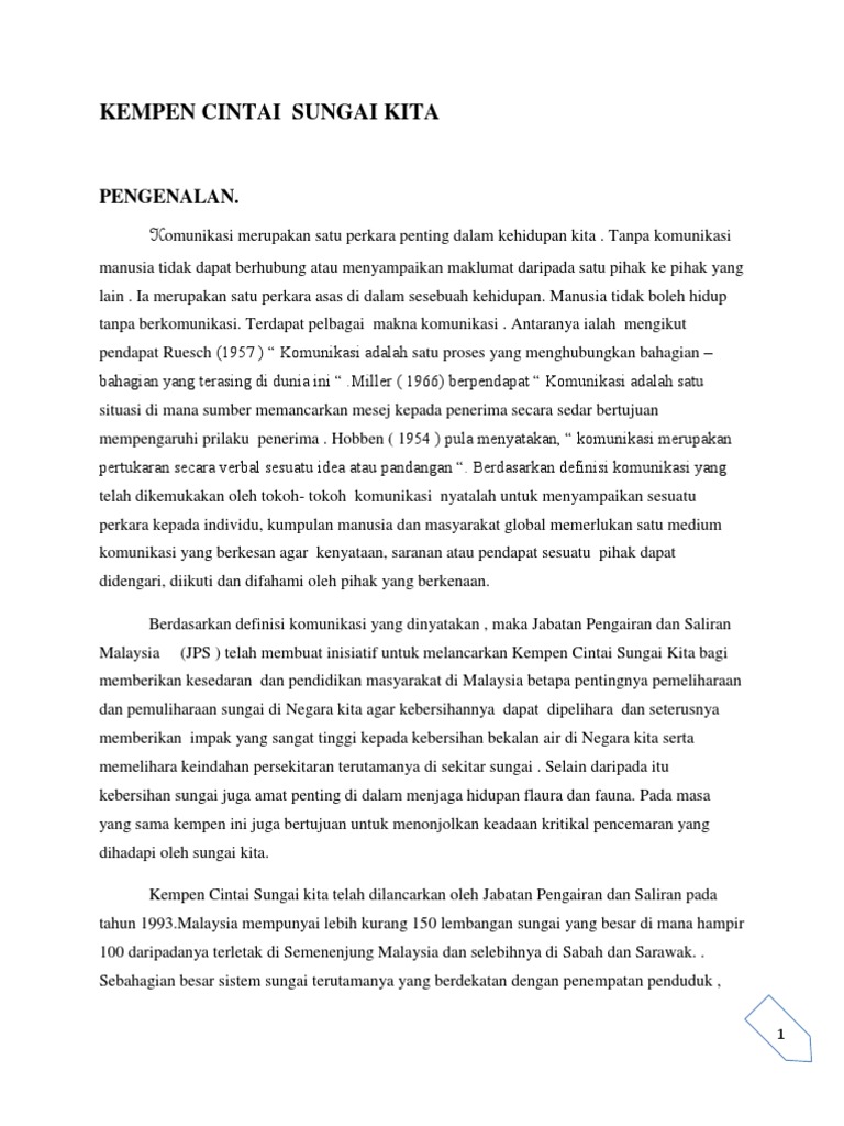 Kempen cintailah sungai kita pelancaran kempen pada awal februari 1993 jabatan pengairan dan saliran kementerian pertanian malaysia telah melancarkan kempen cintailah sungai kita di peringkat nasional. Antara kempen kempen yang boleh dilakukan ialah kempen cintailah sungai kita kempen kitar semula sahabat alam dan sebagainya dalam kempen kempen ini masyarakat akan didedahkan tentang pentingnya menjaga alam sekitar dan cara cara menjaga alam sekitar seperti menguruskan sisa pembuangan supaya kurang memberi pencemaran kepada alam sekitar. Nurul alfian maidin 45 berkata membersih kawasan sungai sudah menjadi amalan penduduk kampung berkenaan sejak dahulu lagi. Latar belakang kempen cintilah sungai kita kempen cintailah sungai kita diperkenakan oleh jabatan pengairan dan saliran jps ekoran kepentingan sungai sebagai kegunaan dan minuman hidupan pembangunan domestik penggerak industri penjana tenaga elektrik negara pengairan untuk pertanian di samping sebagai sumber untuk berekreasi.