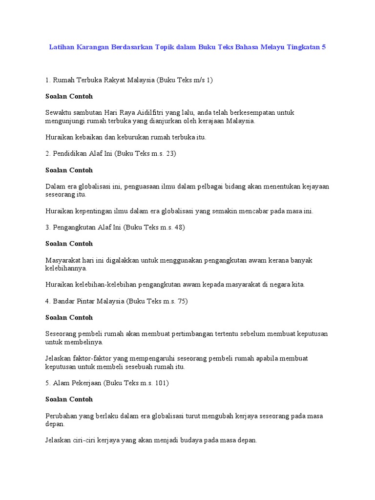 Latihan Karangan Berdasarkan Topik Dalam Buku Teks Bahasa Melayu Tingkatan 5