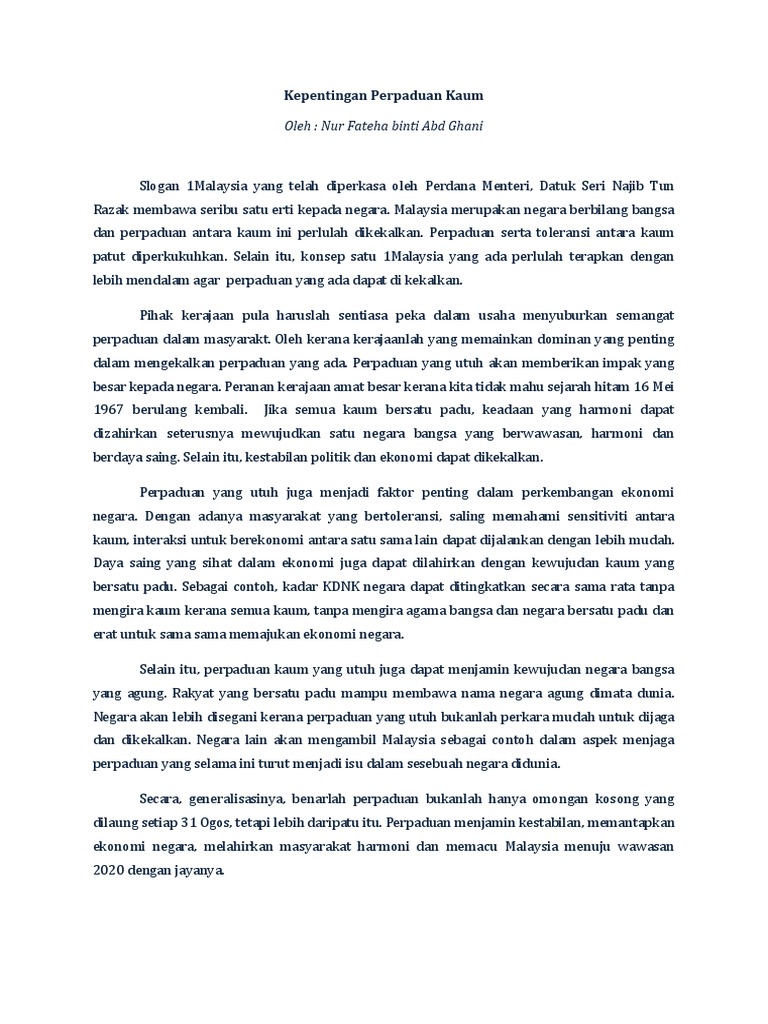 Kepentingan perpaduan antara kaum. Sebagai rakyat malaysia pasti kita sudah tidak asing lagi dengan wujudnya masyarakatberbilang kaum di negara kita seperti cina melayu india kadazan dan sebagainya. Ramai penduduk dunia tertanya tanya apakah formula ampuh yang telah digunakan oleh pemimpin pemimpin berwibawa di malaysia sehingga rakyatnya dapat hidup bersatu padu dan aman damai tanpa sebarang pertelingkahan. Jika kaum kaum tidak mempunyai persefahaman dan toleransi. Kepentingan perpaduan kaum umum mengetahui bahawa malaysia merupakan sebuah negara yang unit lantaran rakyatnya terdiri daripada pelbagai kaum ramai penduduk dunia tertanya tanya apakah formula ampuh.