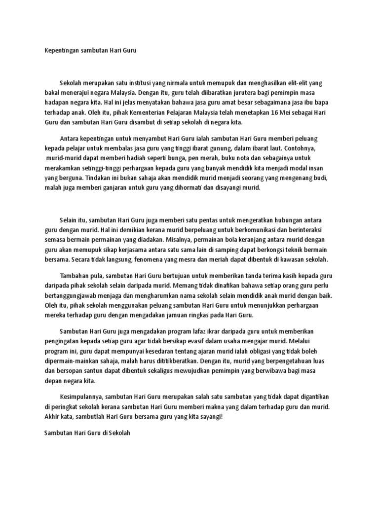 Hari guru nasional tahun 2019 diperingati dengan melaksanakan upacara bendera secara tertib khidmat dan sederhana dengan mengacu pada pedoman upacara bendera salah satu acara dalam upacara hari guru nasional 2019 adalah pembacaan sambutan menteri pendidikan dan kebudayaan mendikbud. Maka marilah kita lapangkan jiwa dan minda untuk menelusuri tujuan sambutan hari guru di peringkat sekolah. July 26 2019 laporan reflektif mpu3133 kursus tamadun islam dan tamadun asia. Seperti yang kita sedia maklum hari guru disambut setiap tahun di peringkat sekolah dengan meriah oleh murid murid dan guru guru.