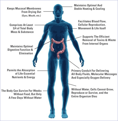 Manusia boleh hidup lagi kalau tiada makanan tapi boleh mati kalau tanpa air. Sel dalam kulit tidak dapat berfungsi dengan baik sekiranya kekurangan air. Keperluan air dalam badan yang di perlukan oleh lelaki adalah 65 manakala bagi perempuan pula memerlukan 55. Air biasa atau air sejuk ia boleh diambil dengan cukup tergantung kepada berat badan anda.