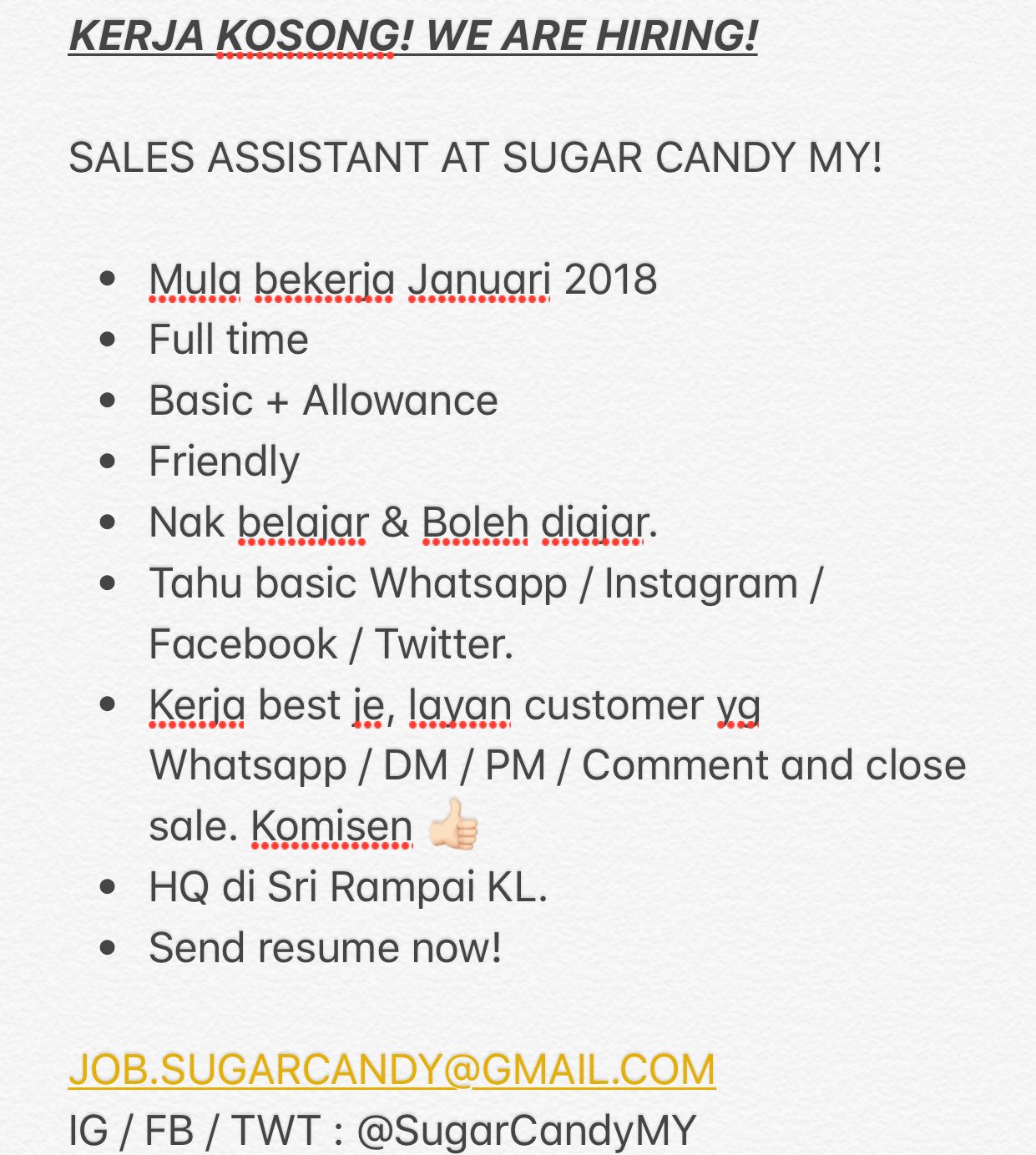 Gatdi On Twitter Kerja Kosong Di Sugarcandymy Jawatan Sales Assistant Lokasi Sri Rampai Kl Basic Commission Rm2500 Tolong Sebarkan Https T Co Kop5fju8q3