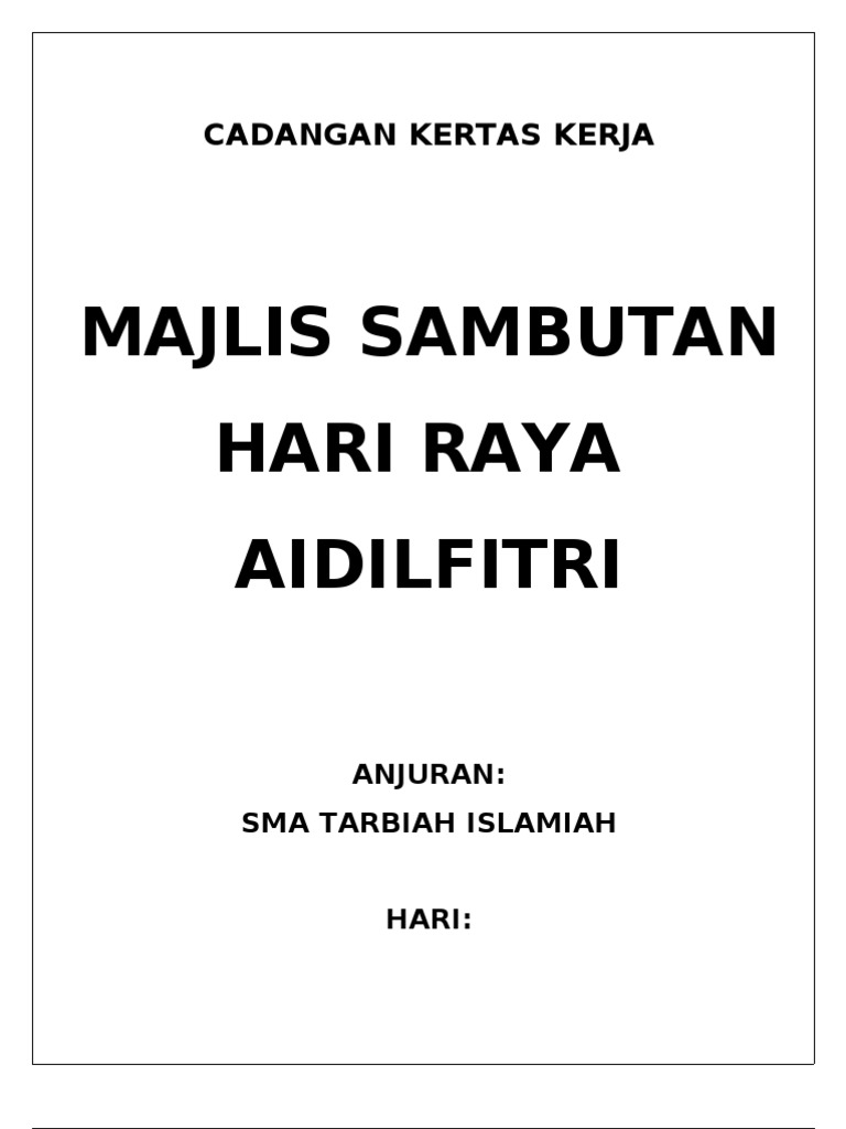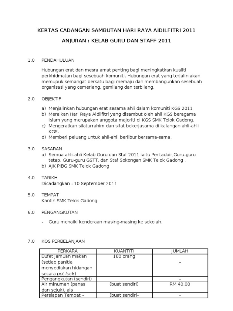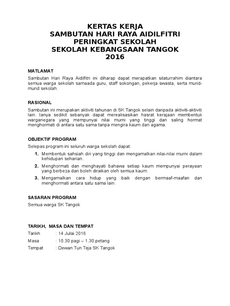 Kertaskerja sambutan hari raya. Bilik seminar sri tebobon 1 0 tujuan kertas kerja ini disediakan bertujuan untuk memberikan panduan pelaksanaan kepada semua warga sekolah untuk menjalankan program tautan kasih hari raya aidilfitri dalam kalangan staff sekolah. Sekolah kebangsaan kinasaraban kota belud kertas kerja majlis sambutan hari raya aidilfitri peringkat sk kinasaraban 2014 t. Sambutan hari raya aidilfitri telah menjadi salah satu daripda acara tahunan yang diraikan secara besar besaran di peringkat negara ia merupakan masa dan waktu yang boleh memberi peluang kepada rakyat untuk meraikan kedatangan bulan syawal setelah menjalankan kewajipan berpuasa di bulan ramadhan.