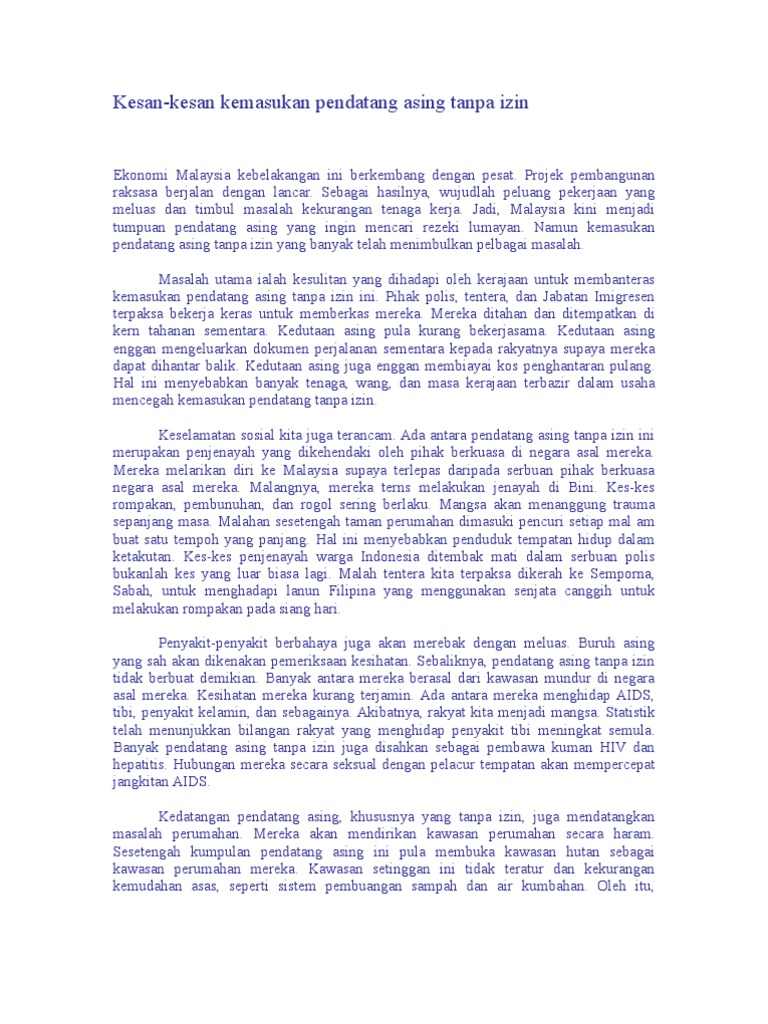 Karangan Perbincangan Kesan Kedatangan Pendatang Asing Di Negara Kita Karangan Bahasa Melayu Pmr