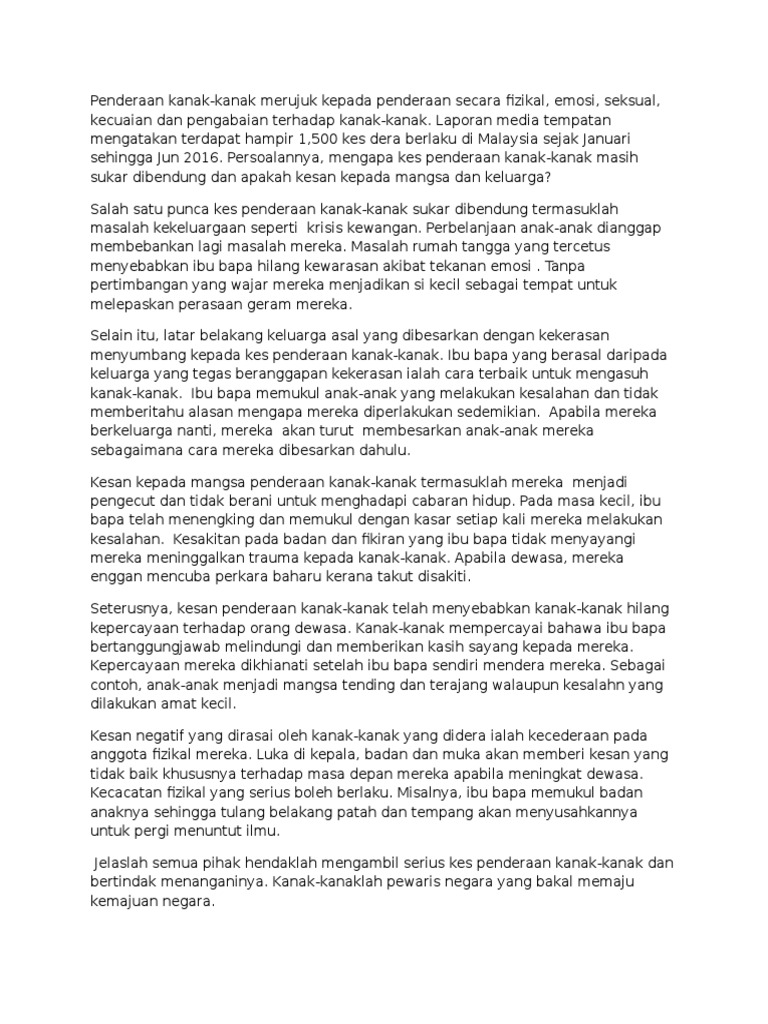 Kesan kes penderaan kepada mangsa dan keluarga. Antara kesan terhadap pendera ialah pendera berkemungkinan akan bertindak dengan lebih agresif dari semasa ke semasa dan ketagih. 4 0 kesan penderaan kanak kanak penderaan kanak kanak meninggalkan banyak kesan kepada pendera mangsa dan masyarakat. Berdasarkan isu tersebut perceraian juga memberi kesan sama ada positif atau negatif kepada sesebuah institusi keluarga. Sebelum ini kes kes penderaan samada fizikal mahupun emosi kurang diperkatakan kerana kebanyakan kes melibatkan ahli keluarga sendiri dan terpaksa didiamkan bagi menjaga nama baik keluarga.